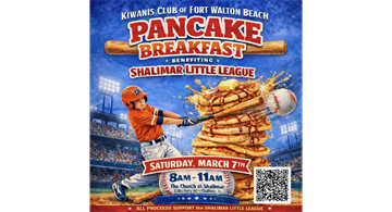 The pancake breakfast will be held at the Church of Shalimar, 1 Old Ferry Rd, Shalimar FL 32579, from 8AM – 11AM.
